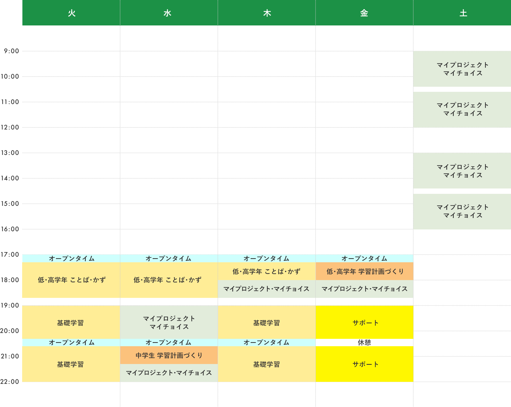 | 学習計画づくり | その週または翌週に何を学ぶのかを、子ども自身が決める |